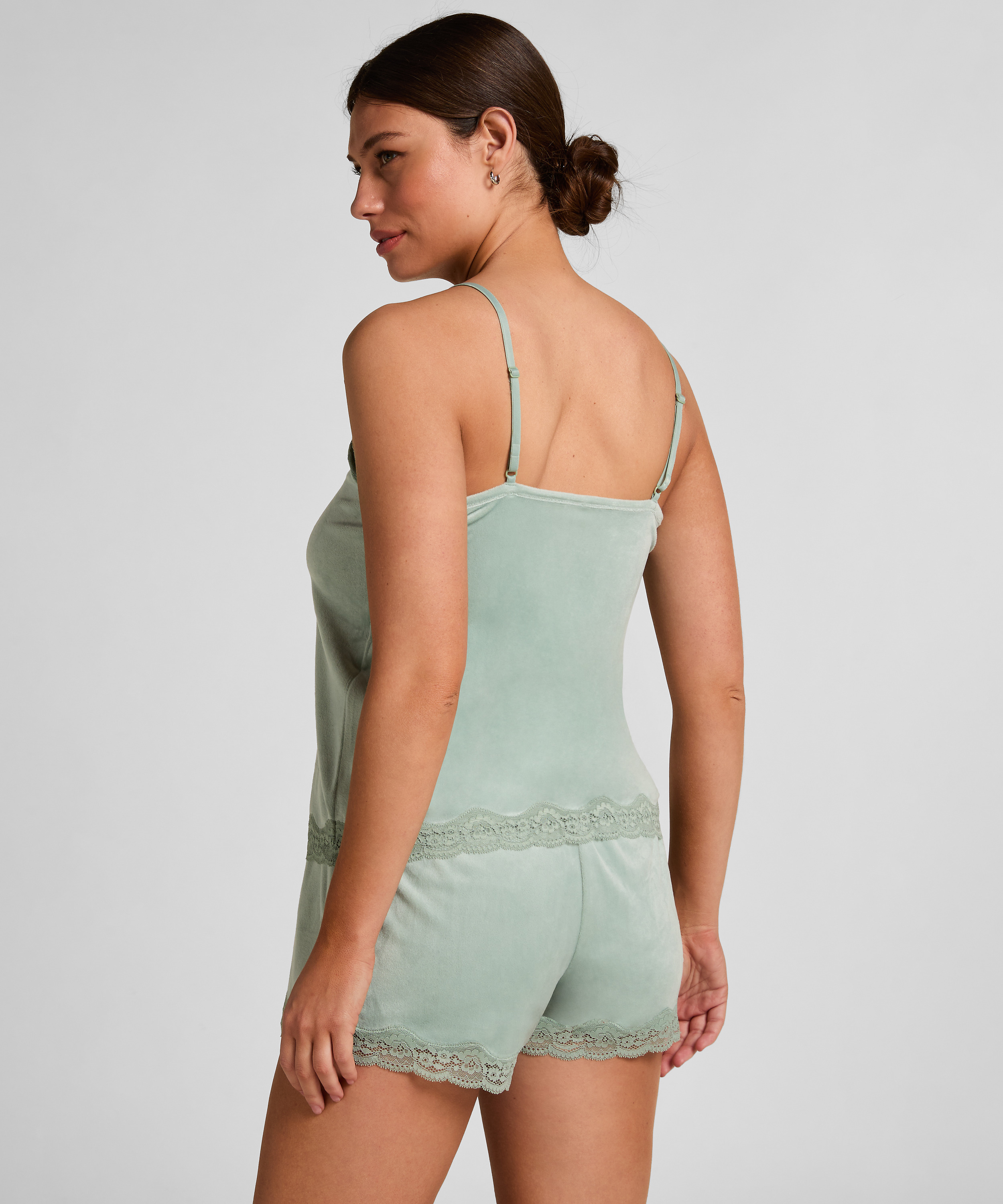 Sentez-vous super sexy et féminine avec ce haut tout doux ! Le short est confectionné en velours et arbore une jolie dentelle. À combiner avec les éléments assortis.