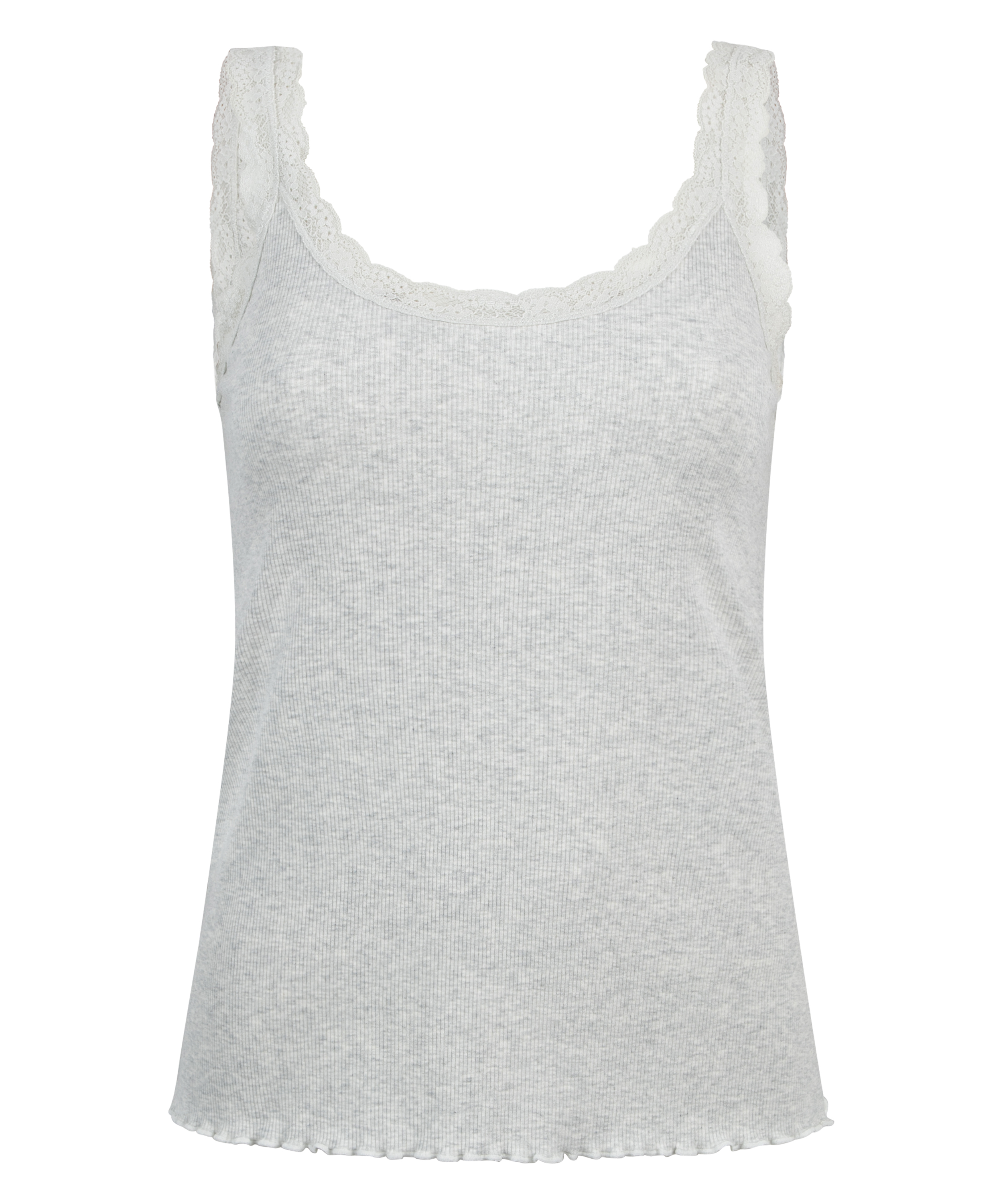 Ce débardeur est fait de tissu côtelé et se termine par une élégante bordure en dentelle. Combinez ce débardeur avec un short assorti. Confortable pour dormir, mais aussi un joli haut pour l'extérieur !