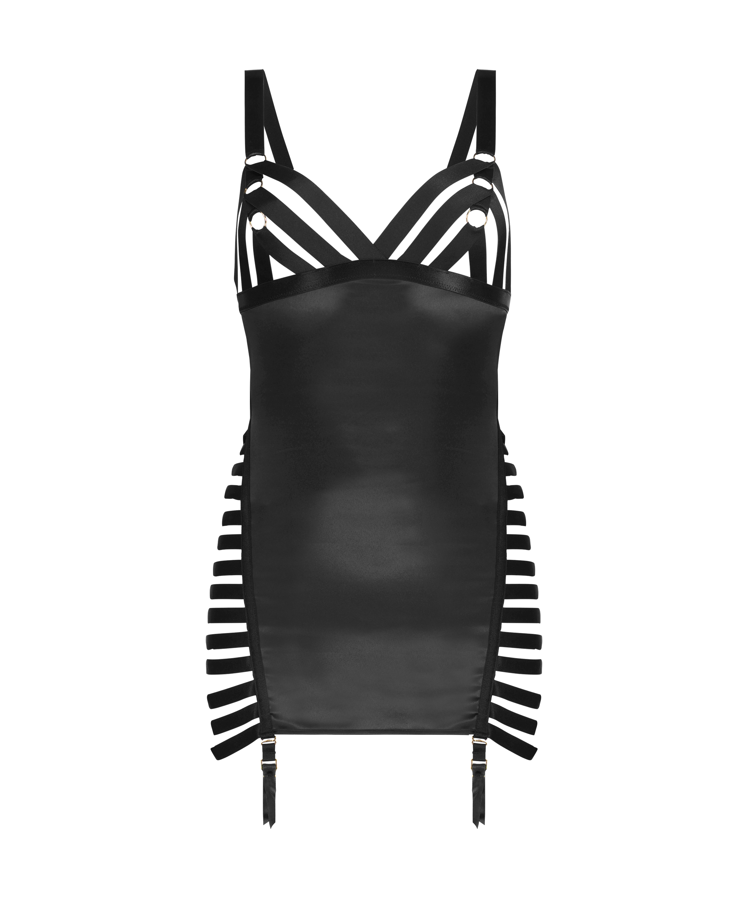 Soyez sexy dans cette nuisette ! Des lanières lui confèrent un style sensuel. Elle se compose de satin sur le devant avec une fermeture éclair au dos. Une ceinture à œillets permet d'y fixer vos bas préférés. Cet article fait partie de notre collection Private.