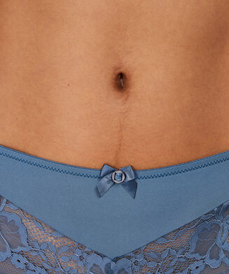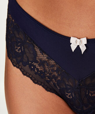 Slip brésilien réalisé à dentelle semi-transparente et tissu brillant. Le slip brésilien est décoré d’un petit nœud raffiné devant. Combinez ce slip avec le soutien-gorge assorti pour compléter votre parure !