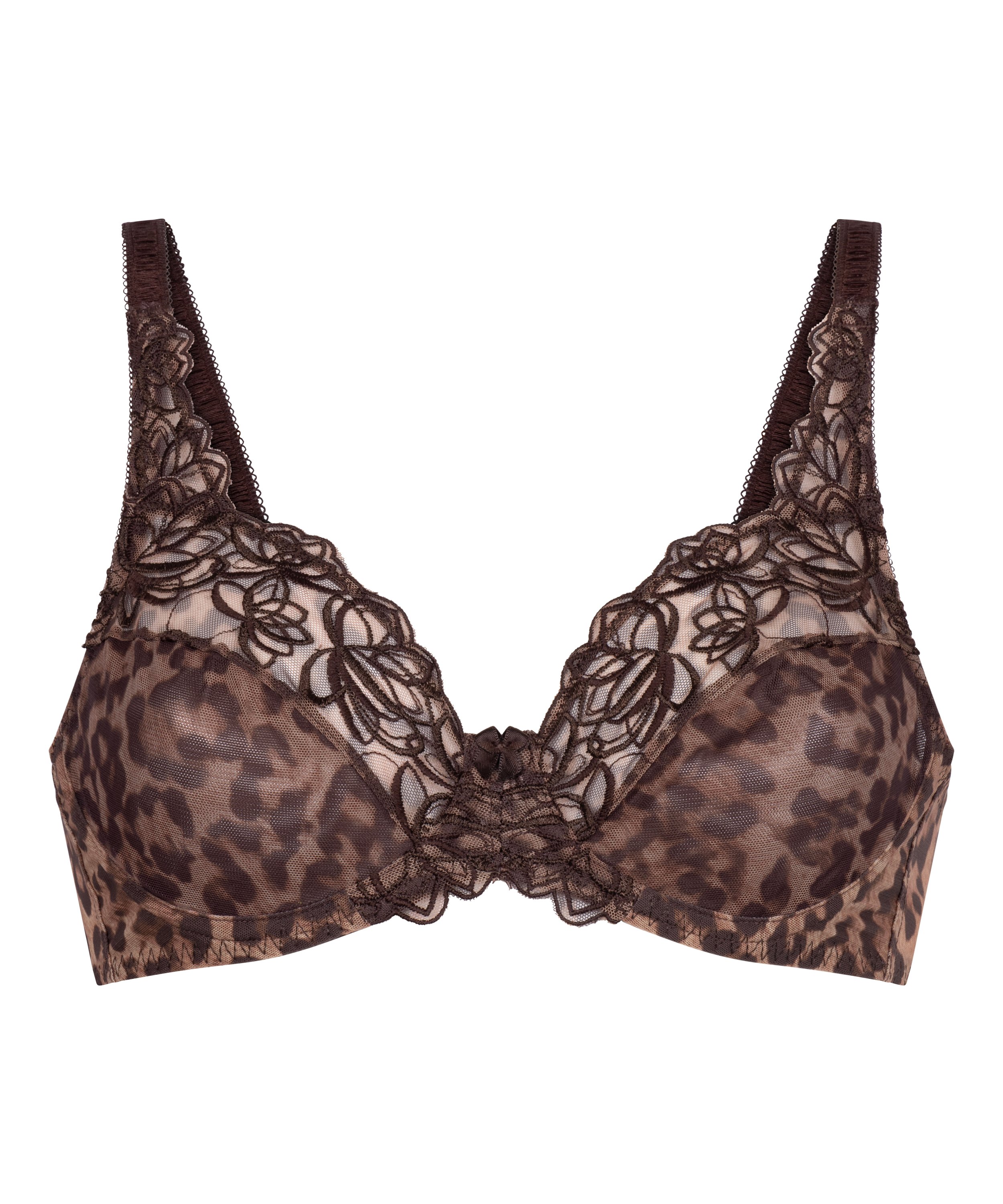 Ce soutien-gorge à armatures non-préformé est réalisé dans une qualité opaque et décoré de dentelle semi-transparente sur le haut. Les bonnets ont un élégant motif à fleurs. Complétez votre parure avec le slip Diva assorti.