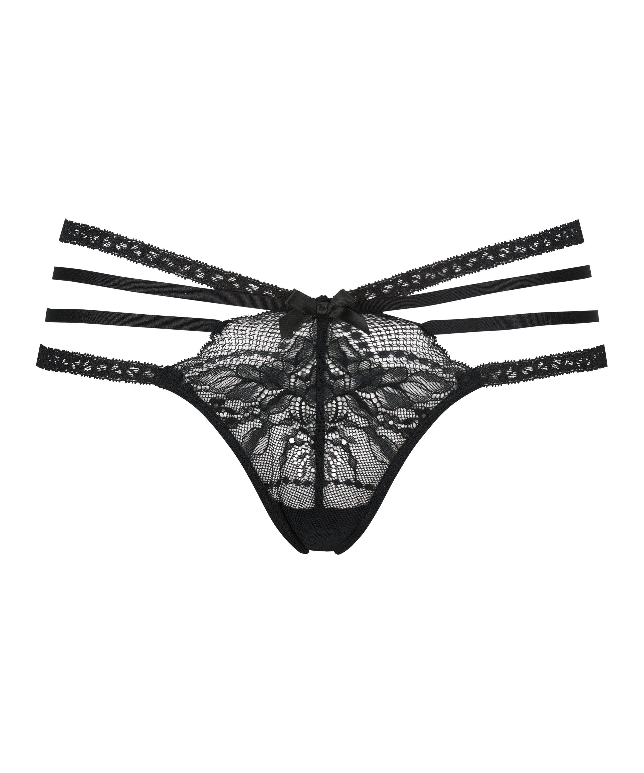 Voel je super sexy in deze string! Hij is voor een groot deel van kant, er zit een leuk strikje aan de voorkant en de strappy details zijn de finishing touch. Combineer met je eigen favoriete items!