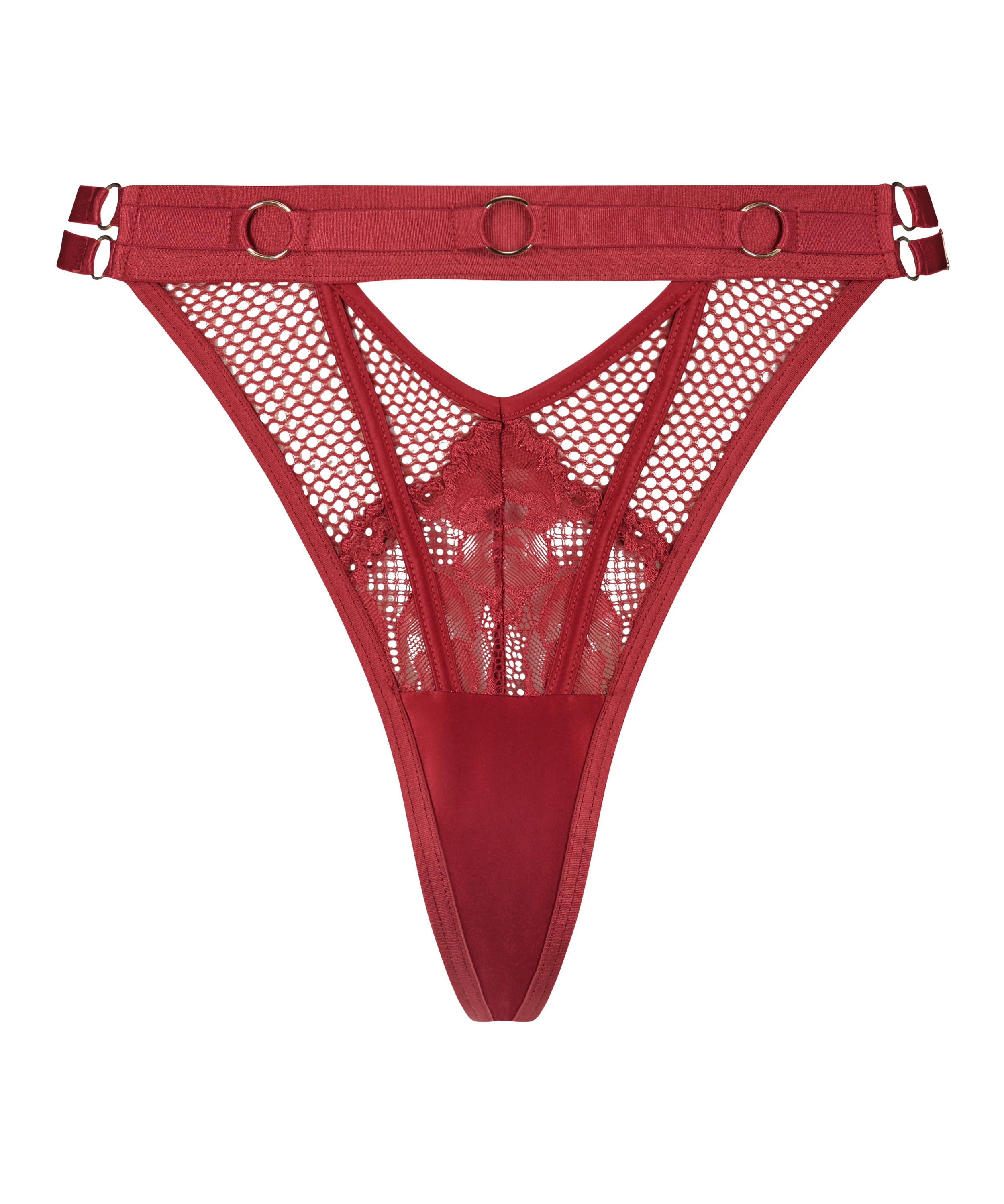 Passez au niveau supérieur avec ce tanga super sexy ! Fabriqué en filet de pêche, décoré de dentelle et de détails à lanières pour un look osé. Il y a des détails découpés à l'avant et à l'arrière, ainsi que des éléments matériels sur la bande épaisse. Trouvez le bustier et complétez le look !