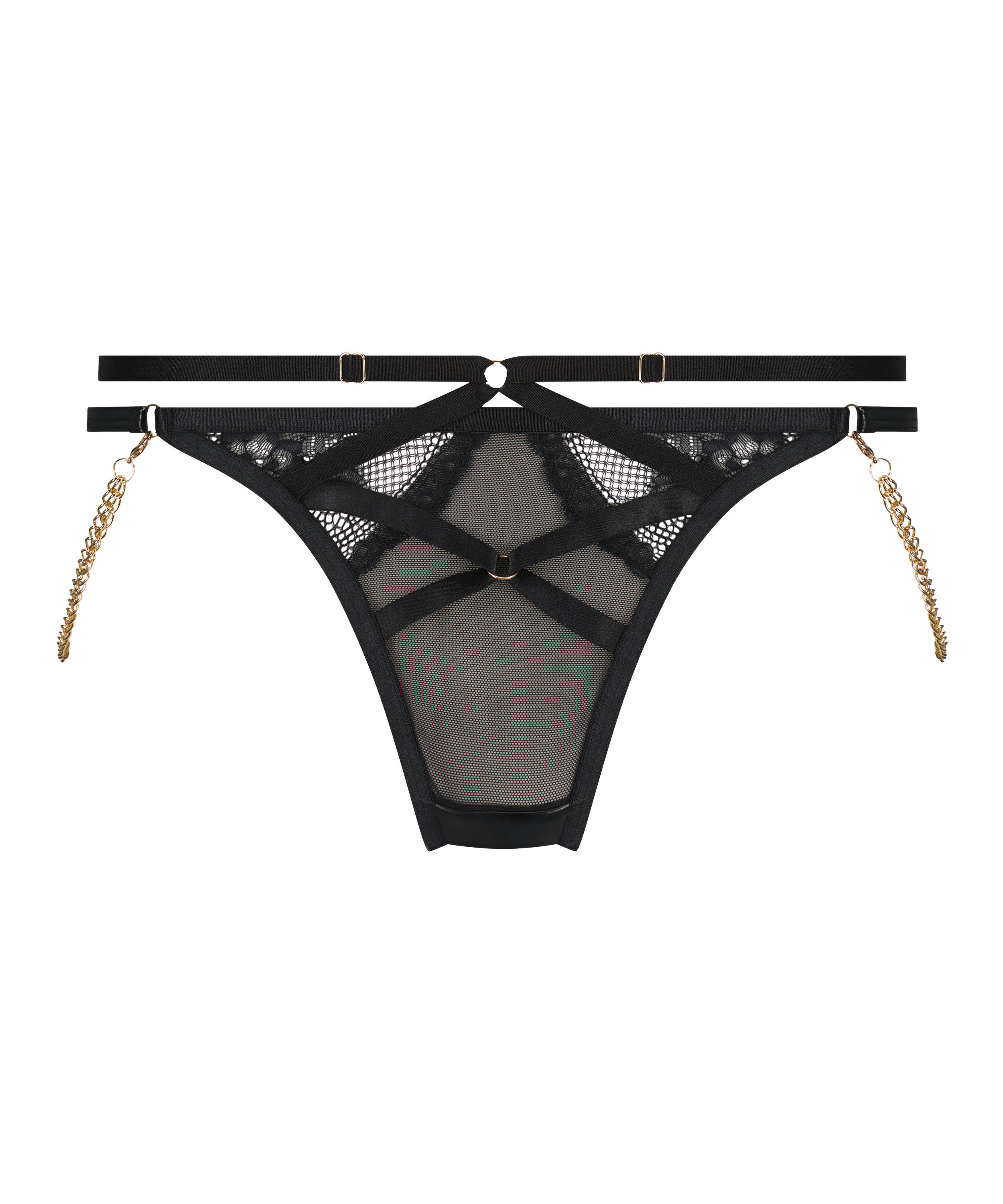 Faites passer votre ensemble de lingerie au niveau supérieur avec ce string super sexy ! Fabriqué à partir de tissu en maille, décoré de dentelle et de détails à lanières pour un look épicé. Il y a un détail découpé dans le dos et le string est orné d'une chaîne dorée amovible. Associez-le au bustier Hécate pour compléter l'ensemble !