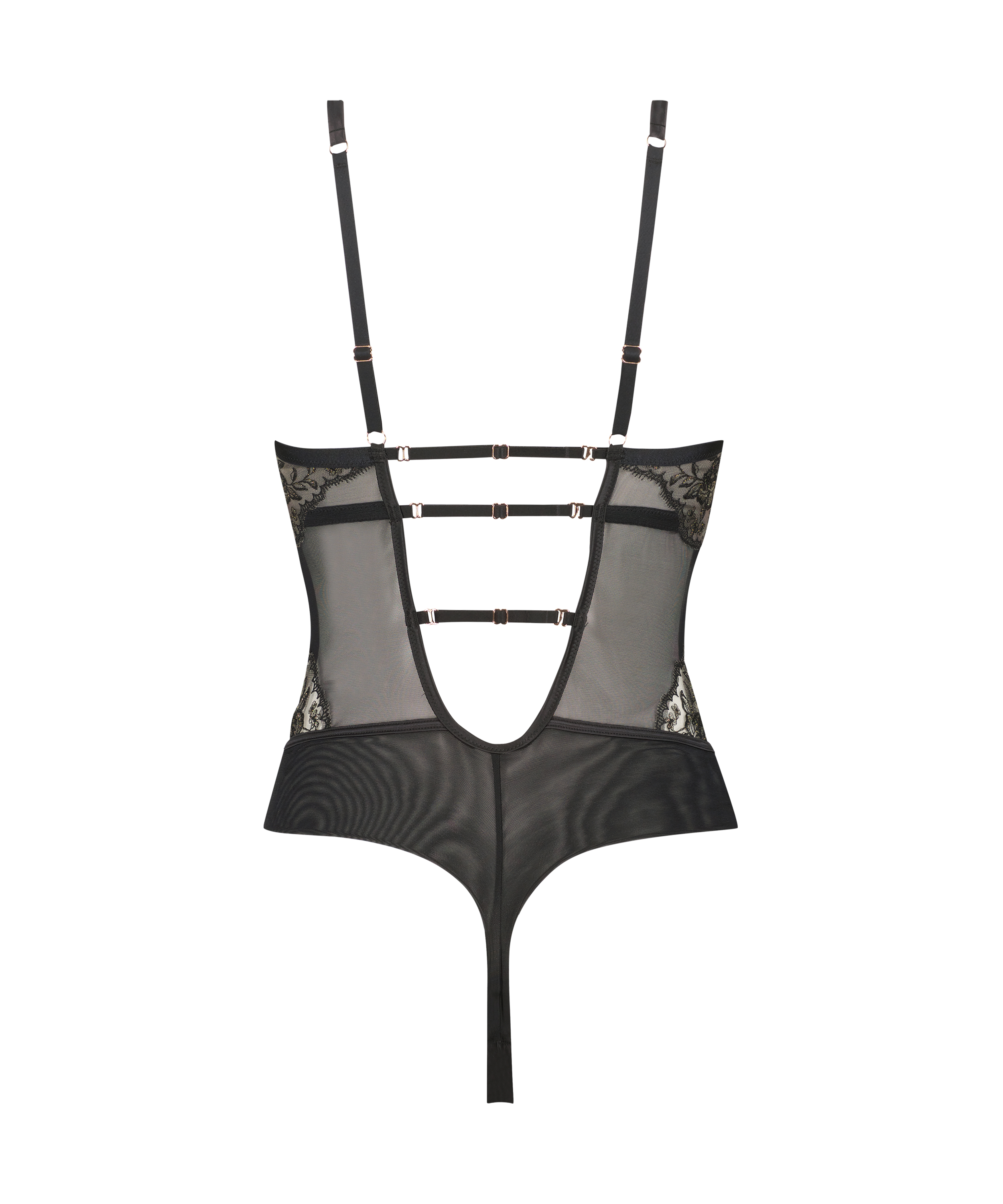Deze prachtige body biedt een elegante look. De doorschijnende en kanten details maken deze body helemaal af. Bekijk de items uit de Noir Collectie om deze look helemaal af te maken!
