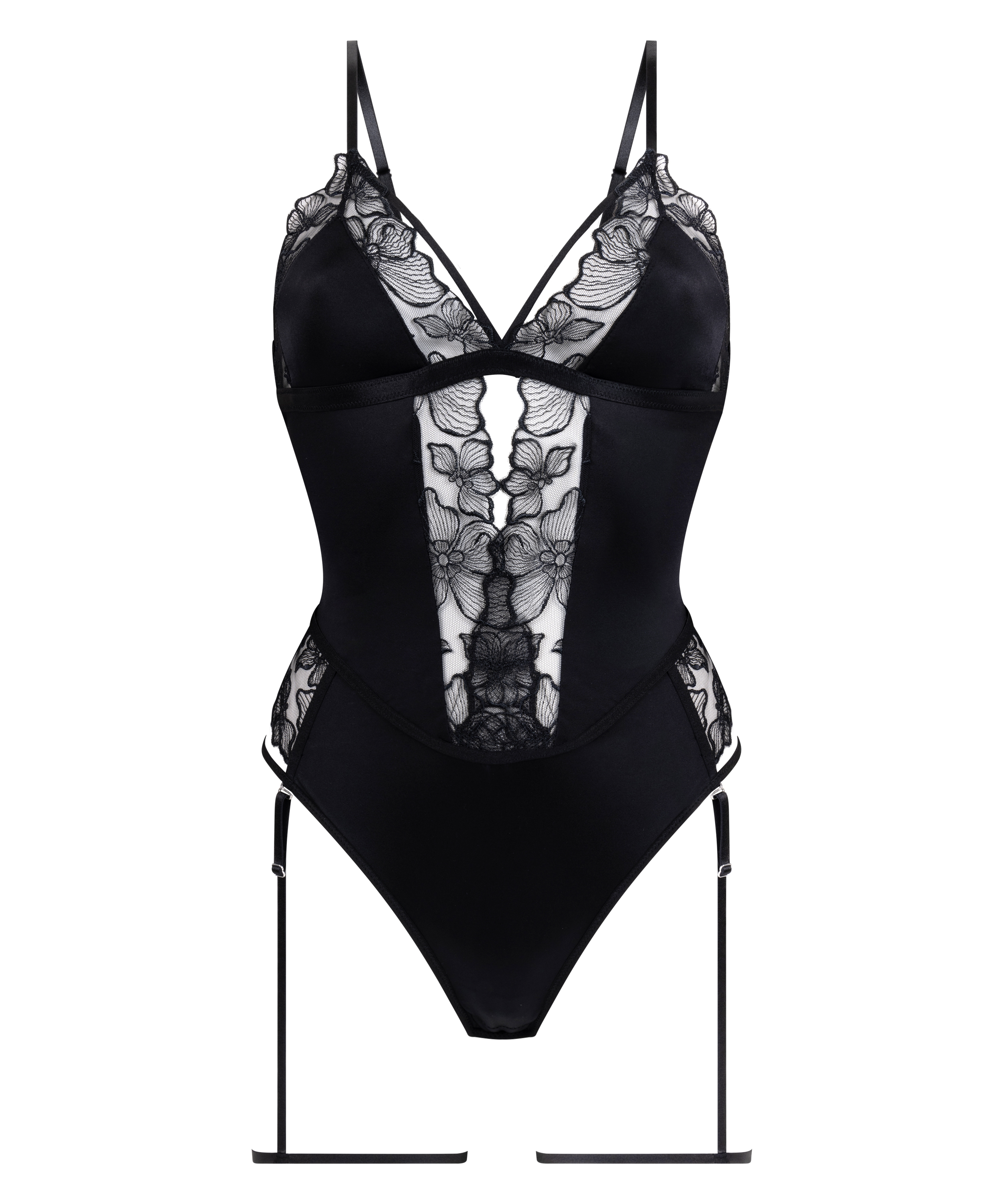 Onze aantrekkelijke body is een gedurfd en geraffineerd kledingstuk dat is ontworpen om een statement te maken. Door de combinatie van fijn kant en zijdeachtig satijn voelt deze body luxueus aan en ziet hij er betoverend uit. Het uitgesneden detail aan de voorkant zorgt voor een leuke touch. De afneembare jarretelgordel biedt veelzijdige stylingopties, zodat je je look moeiteloos kunt aanpassen.