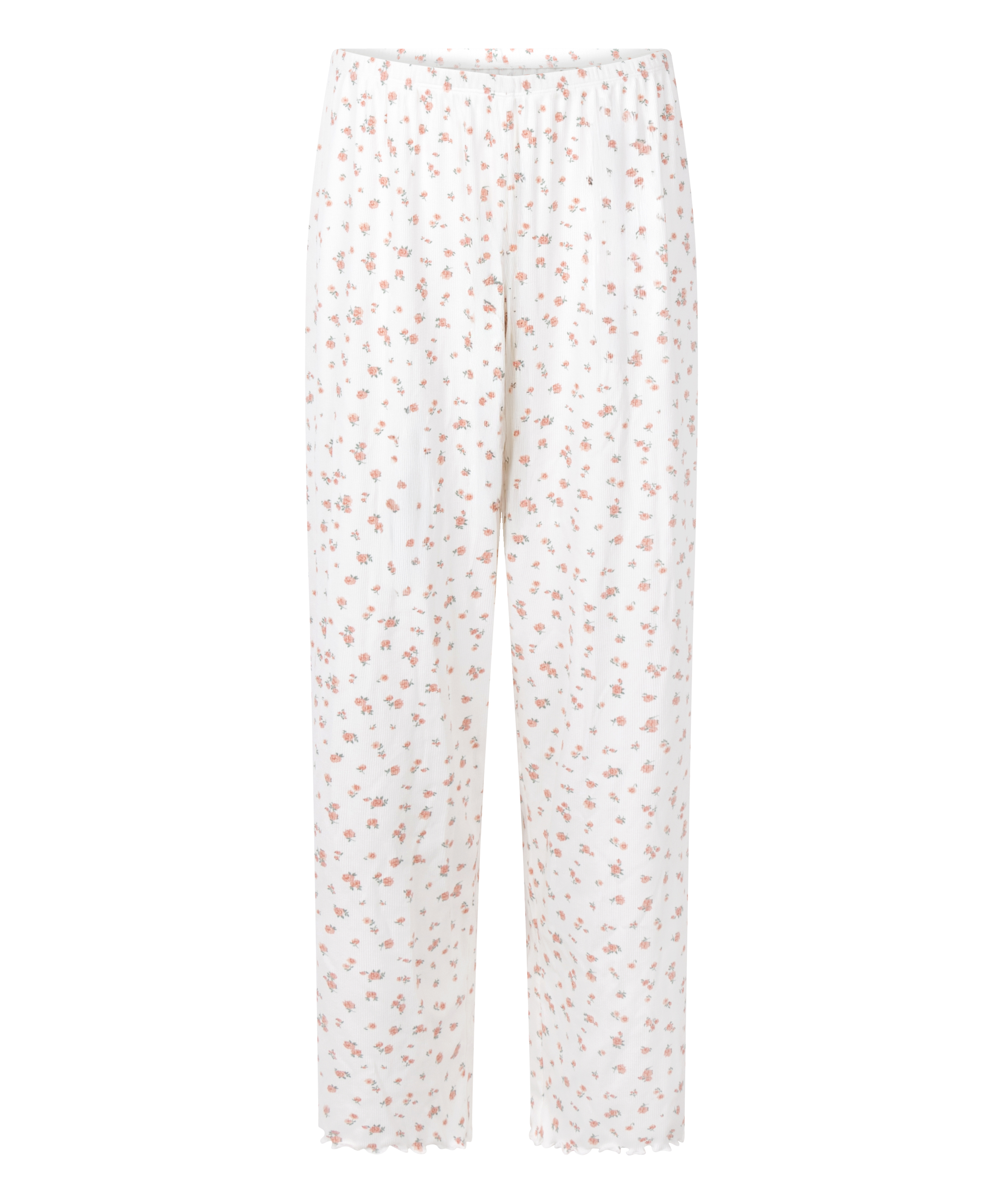 Knus comfort met een flirterige afwerking! Deze geribde pyjamabroek heeft een elastische tailleband en delicate ruches langs de zoom, waardoor hij perfect is voor ontspannen avonden en rustige nachten.