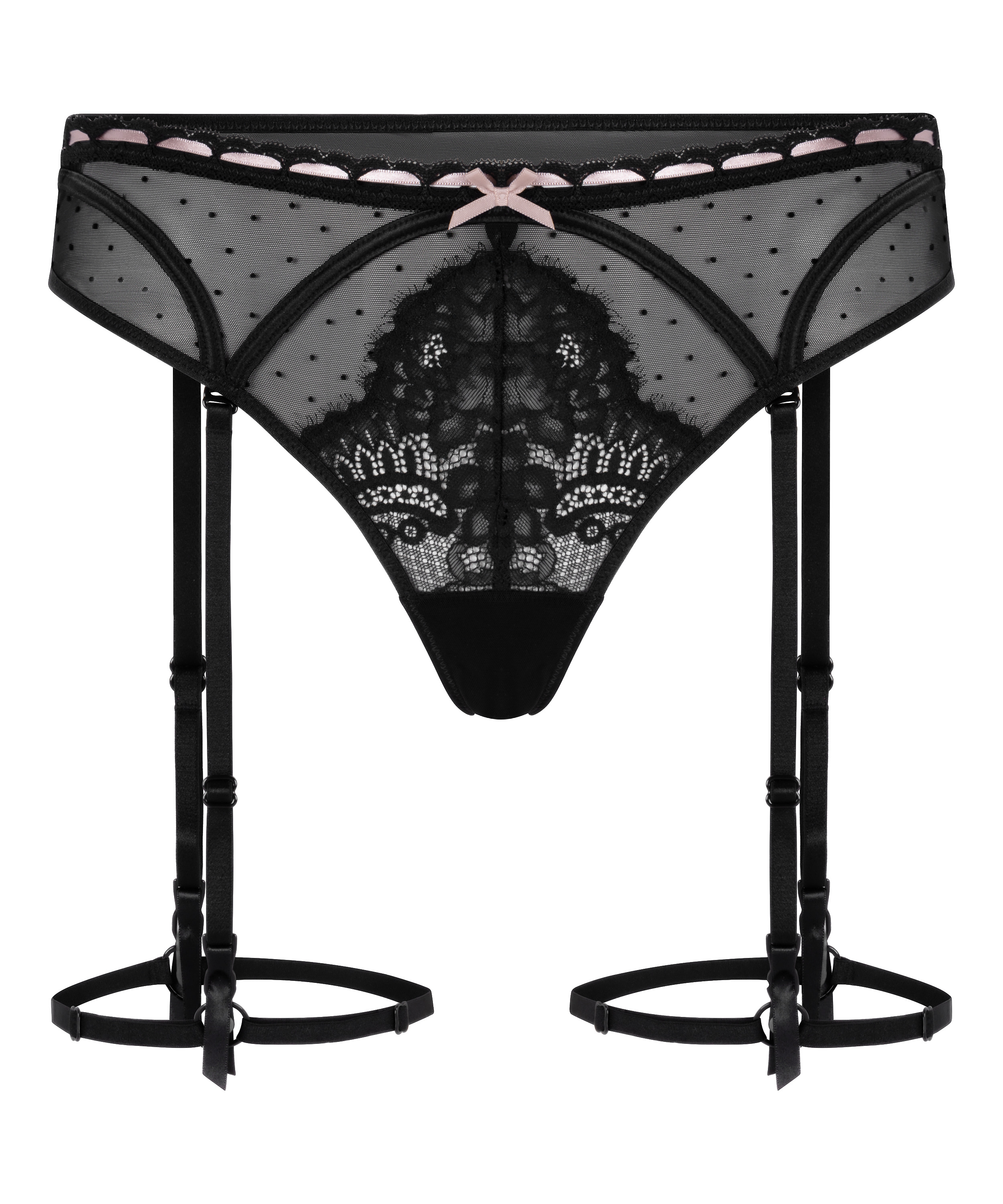 Ga voor de meest gedurfde look met deze jarretelgordel string, gemaakt van romantisch bloemen- en stippenkant voor een speels tintje. De schattige strikdetails voegen een vrouwelijk tintje toe en het gekreukte ontwerp aan de achterkant geeft een flatterend, ondeugend silhouet. De verstelbare bandjes garanderen een goede bevestiging van je favoriete stocking. Perfect in combinatie met de bijpassende bh en bralette!