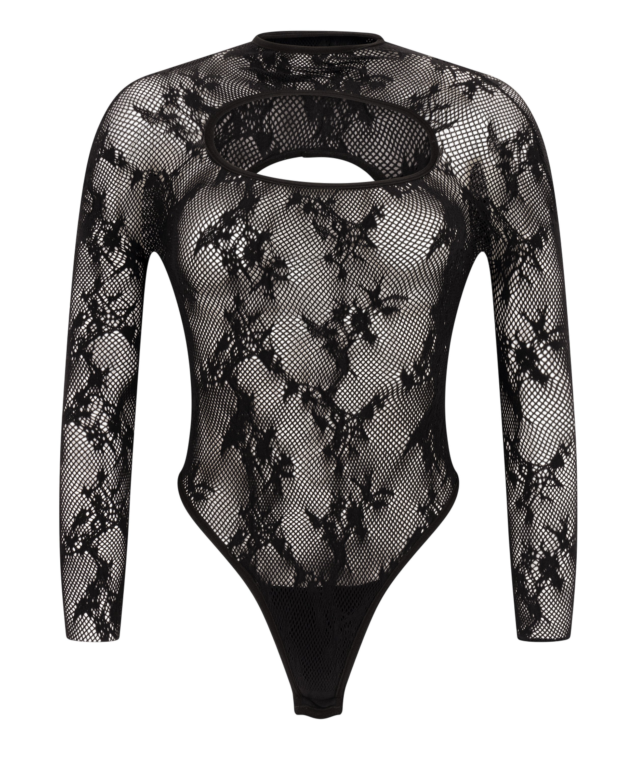 Maak een statement met deze gewaagde visnet body, ontworpen om op te vallen en je zelfvertrouwen te geven. Het is gemaakt van visnetstof en heeft een opvallende uitsnijding aan de voorkant die een uitdagende touch toevoegt aan het elegante silhouet. De body omhelst je rondingen met een flatterende pasvorm.