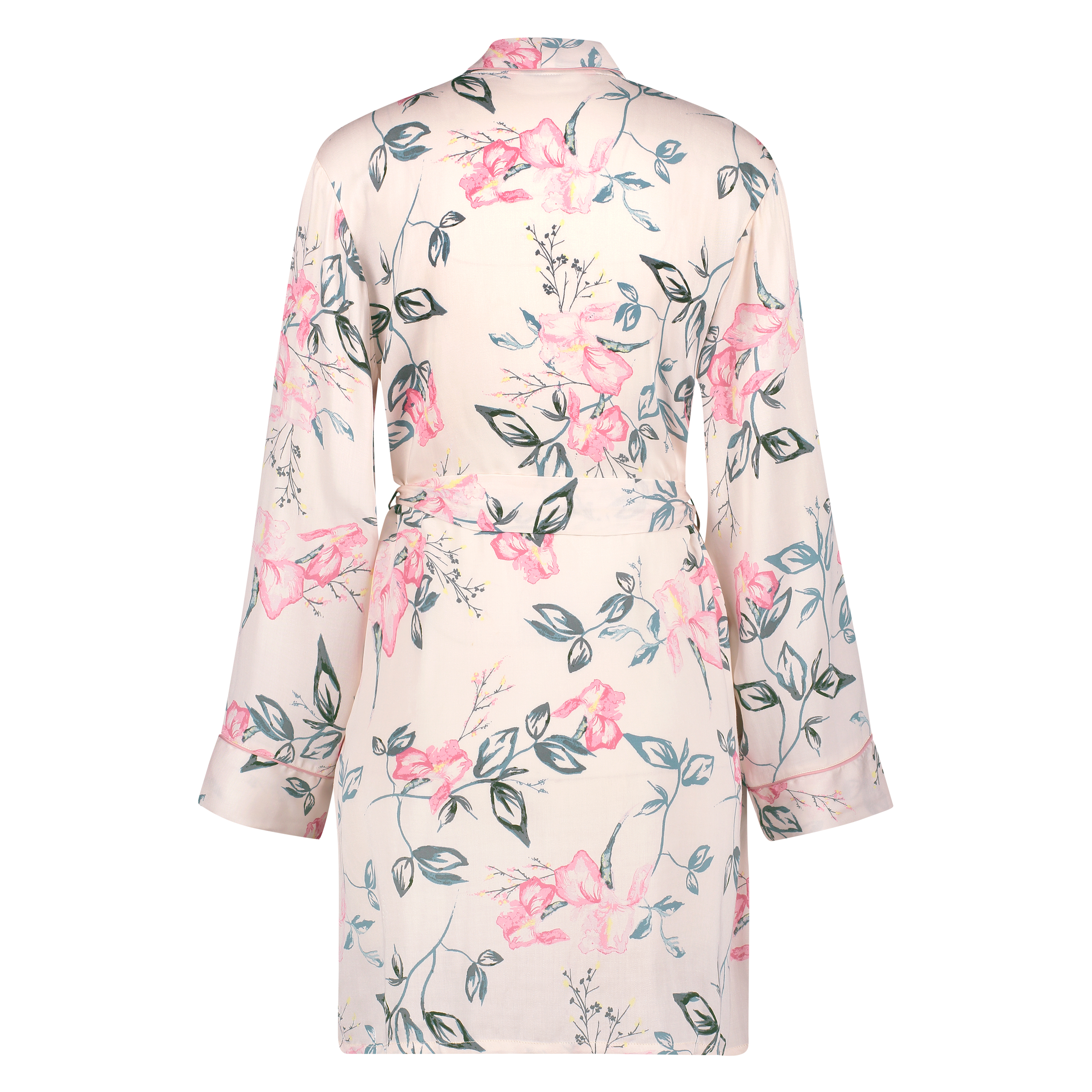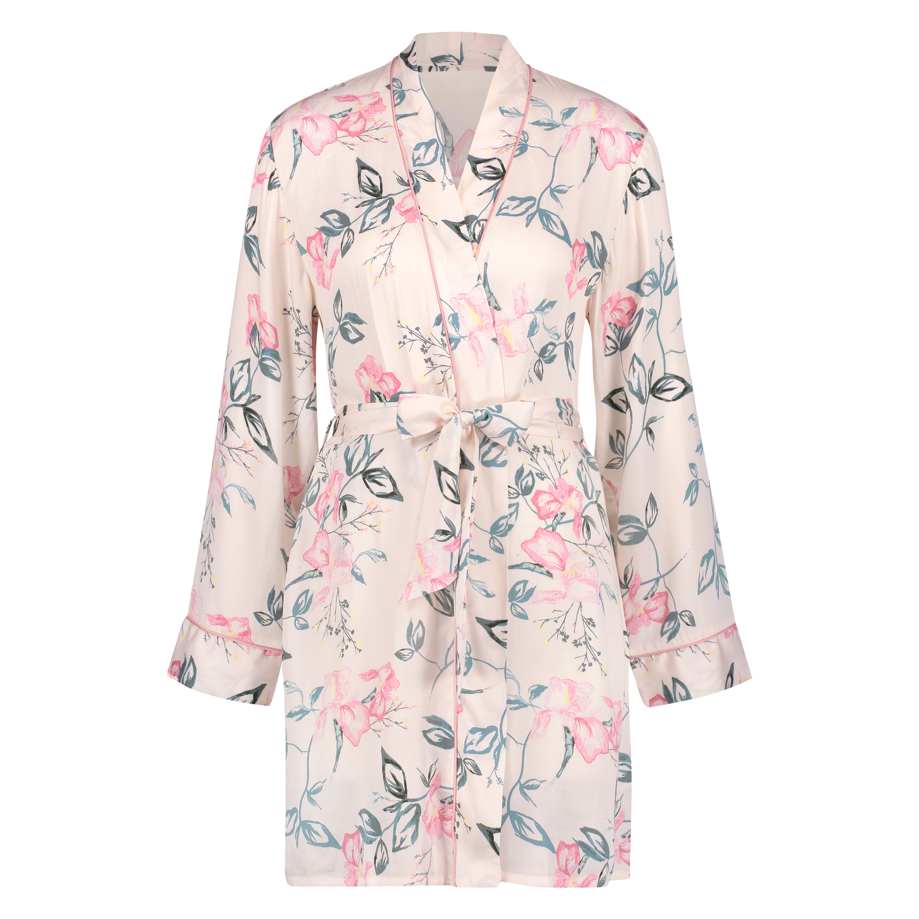Deze kimono geeft een vrolijke touch aan je look! De kimono is gemaakt van een luchtige stof en is afgewerkt met roze biesjes.