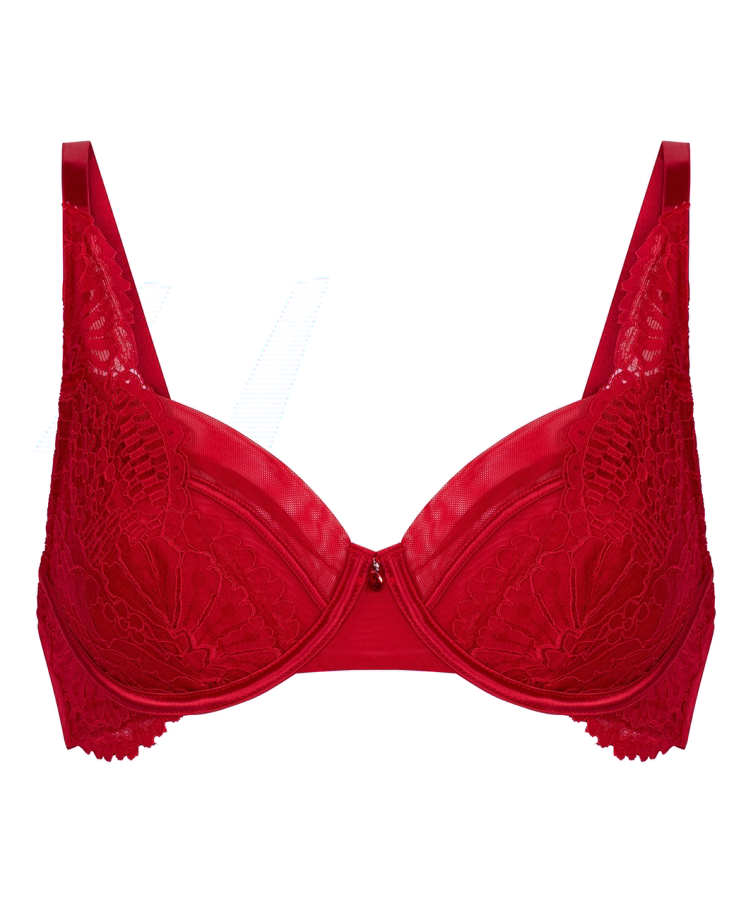 Elegantie zit in de details bij deze verfijnde bh, die ontworpen is om je natuurlijke vormen te benadrukken en een vleugje sprankeling toe te voegen. De niet-voorgevormde cups bieden een zacht silhouet, ondersteund door beugels voor een zachte lift en definitie. Het ontwerp is gemaakt van kant en afgewerkt met een glinsterend sieraad in het midden. Combineer hem met het bijpassende broekje voor een complete look.