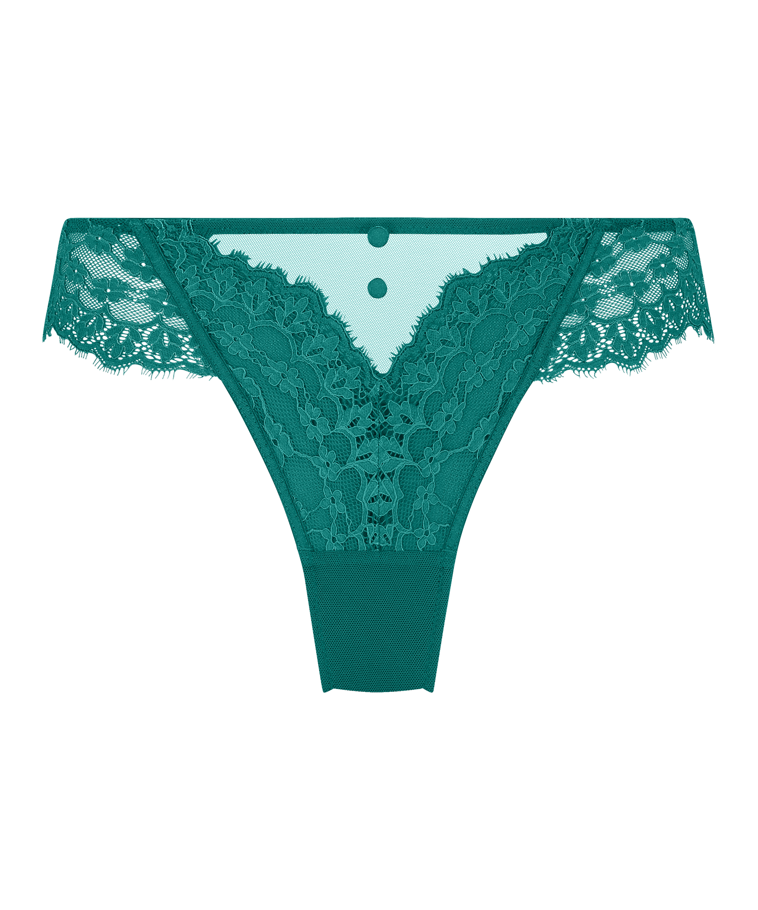 Trendy string dat is uitgevoerd met transparant kant aan de voorzijde en mesh aan de achterzijde. Aan de voorzijde zit in het midden een knoopje.
