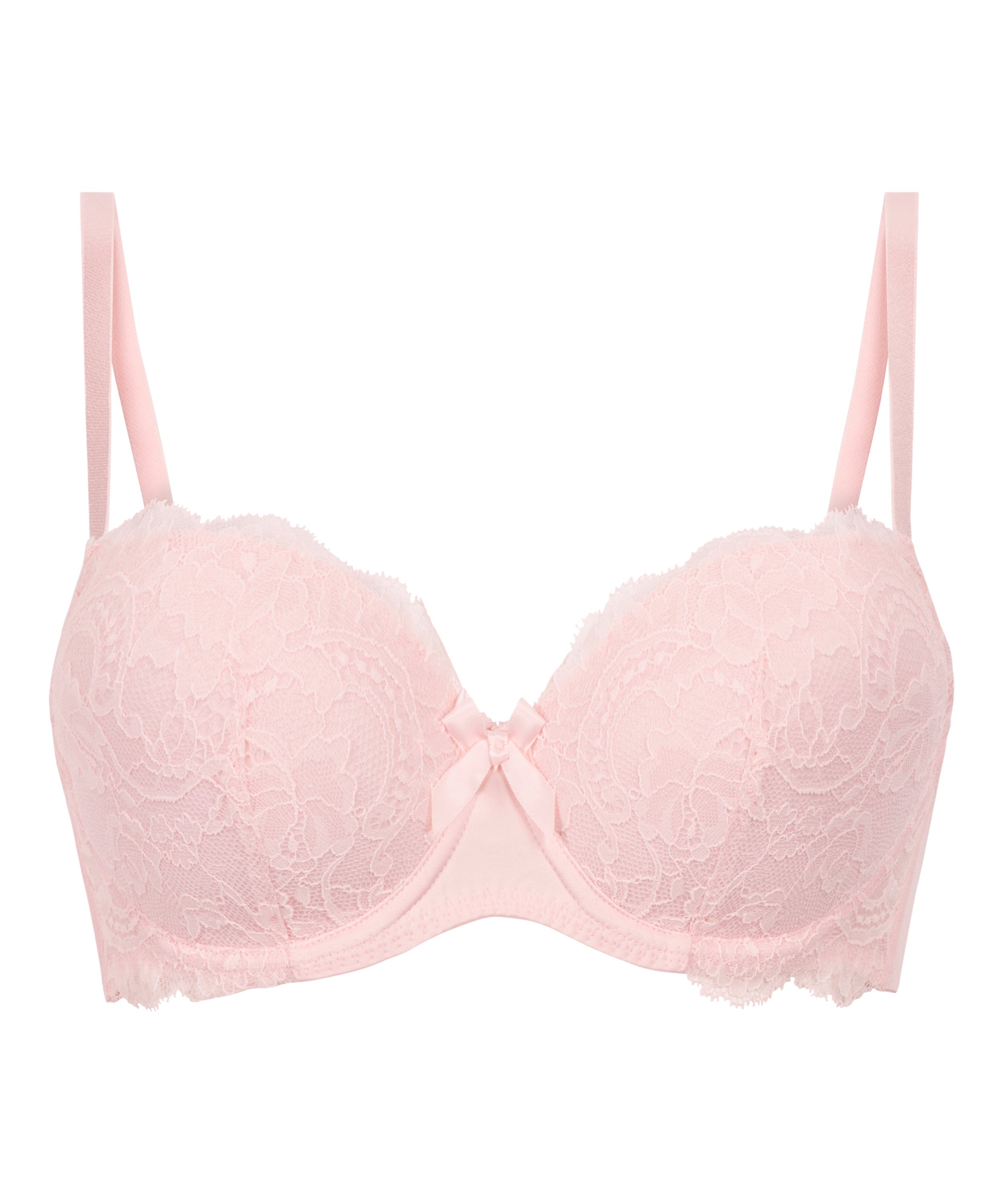 Dit is de perfecte bh voor jou! De bh heeft voorgevormde cups met beugel en de schouderbandjes kunnen naar wens worden versteld. De bh is afgewerkt met kant en heeft een strikje tussen de cups.
